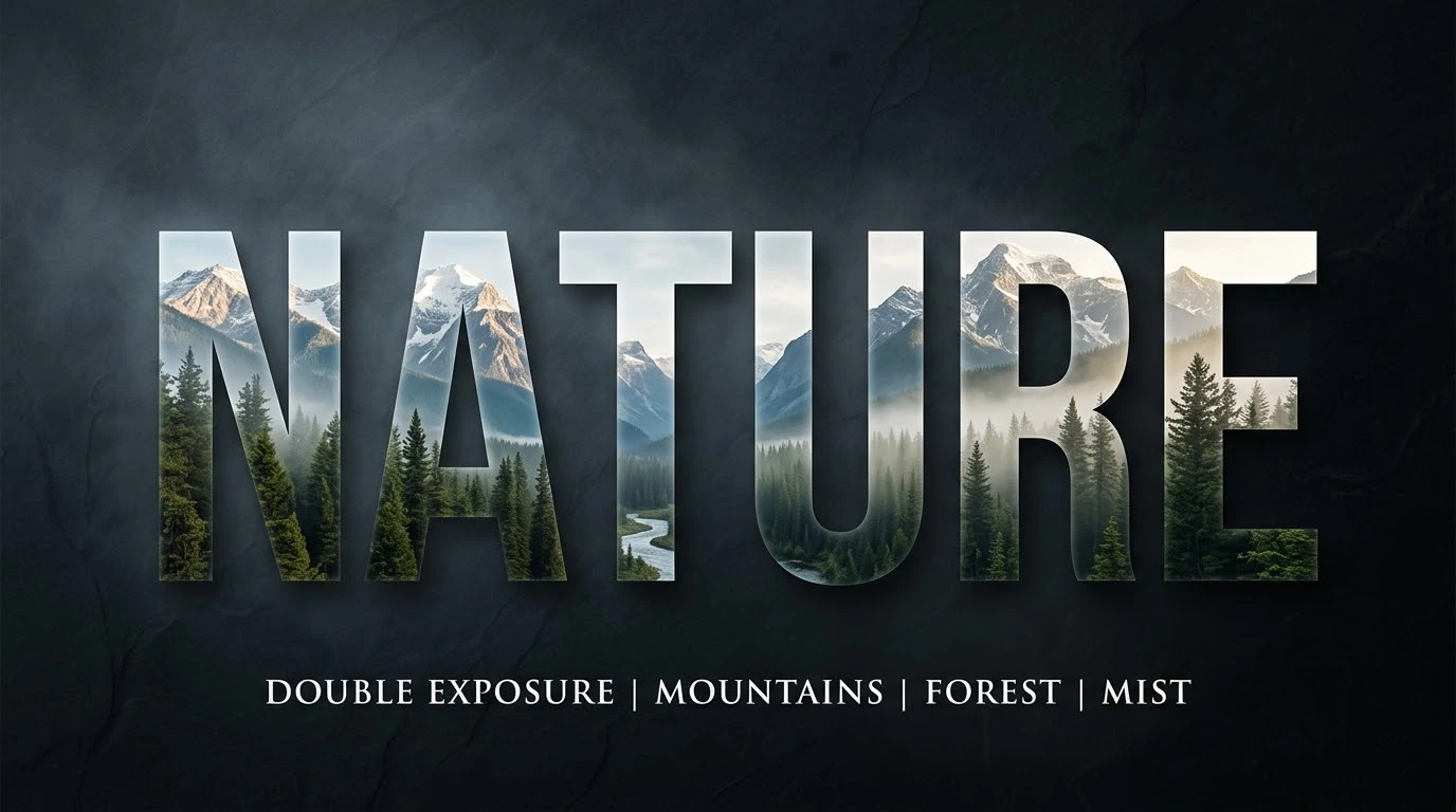[TEXT] in double exposure typography, letters filled with detailed nature scenes such as mountains, forest and mist, clean edge masking, no spill outside text, cinematic lighting, soft atmospheric haze, high contrast between text and background, ultra realistic textures, premium poster quality, aspect ratio [AR]