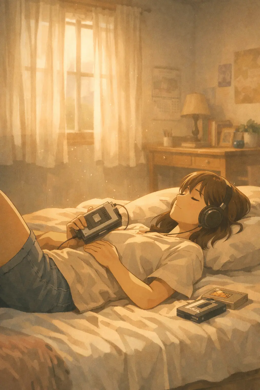 Anime retro style late afternoon bedroom interior, sunlight streaming through sheer curtains, floating dust particles glowing in warm beam, faded pastel wall tones, soft shadow blending, character lying on bed listening to cassette player, muted color grading, gentle bloom lighting, nostalgic calm atmosphere Anime Retro Seaside Bus Stop Prompt: