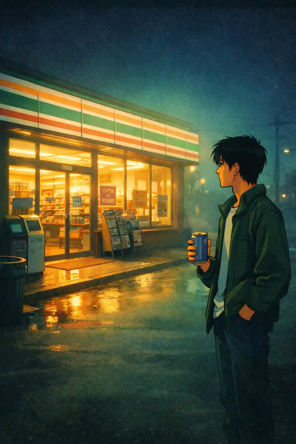 Anime retro style 90s animated convenience store glowing under soft fluorescent lights at midnight, humid summer haze in the air, lone character standing outside holding canned drink, warm interior light spilling onto cool pavement, subtle VHS grain texture, muted amber and teal harmony, analog shadow gradients, soft bloom highlights, strong depth layering, quiet emotional tone Anime Retro Summer Train Crossing Prompt: