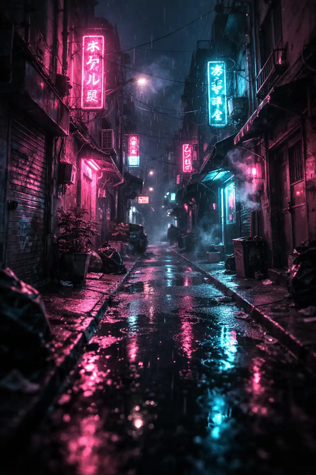 Anime retro style narrow alley at night with light rain falling, neon signage reflecting across puddles, cigarette smoke mixing with cool mist, muted magenta and cyan palette, soft CRT glow effect, faded highlights, analog grain texture, layered atmospheric depth, cinematic framing, introspective urban mood Anime Retro Rooftop Golden Hour Prompt: