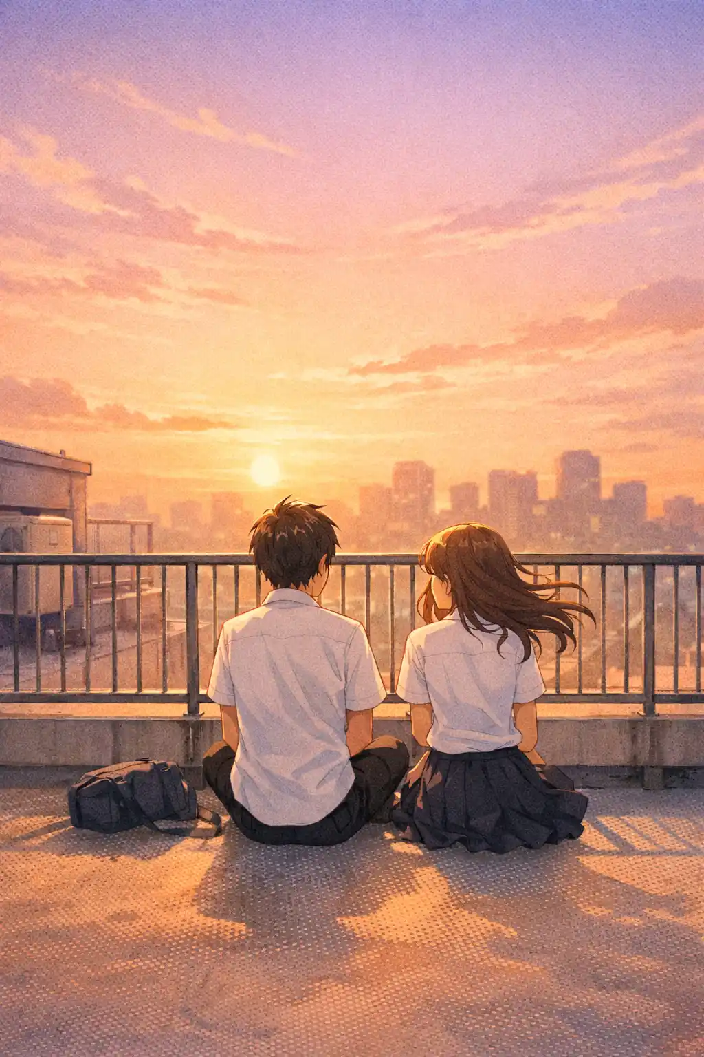 Anime retro style school rooftop during sunset, warm sunlight diffusing through thin clouds, distant city skyline softly blurred, two characters sitting near railing with wind moving hair gently, pastel peach-to-lavender sky gradient, halftone shadow texture, subtle grain overlay, slice-of-life stillness Anime Retro Bedroom Light Particles Prompt: