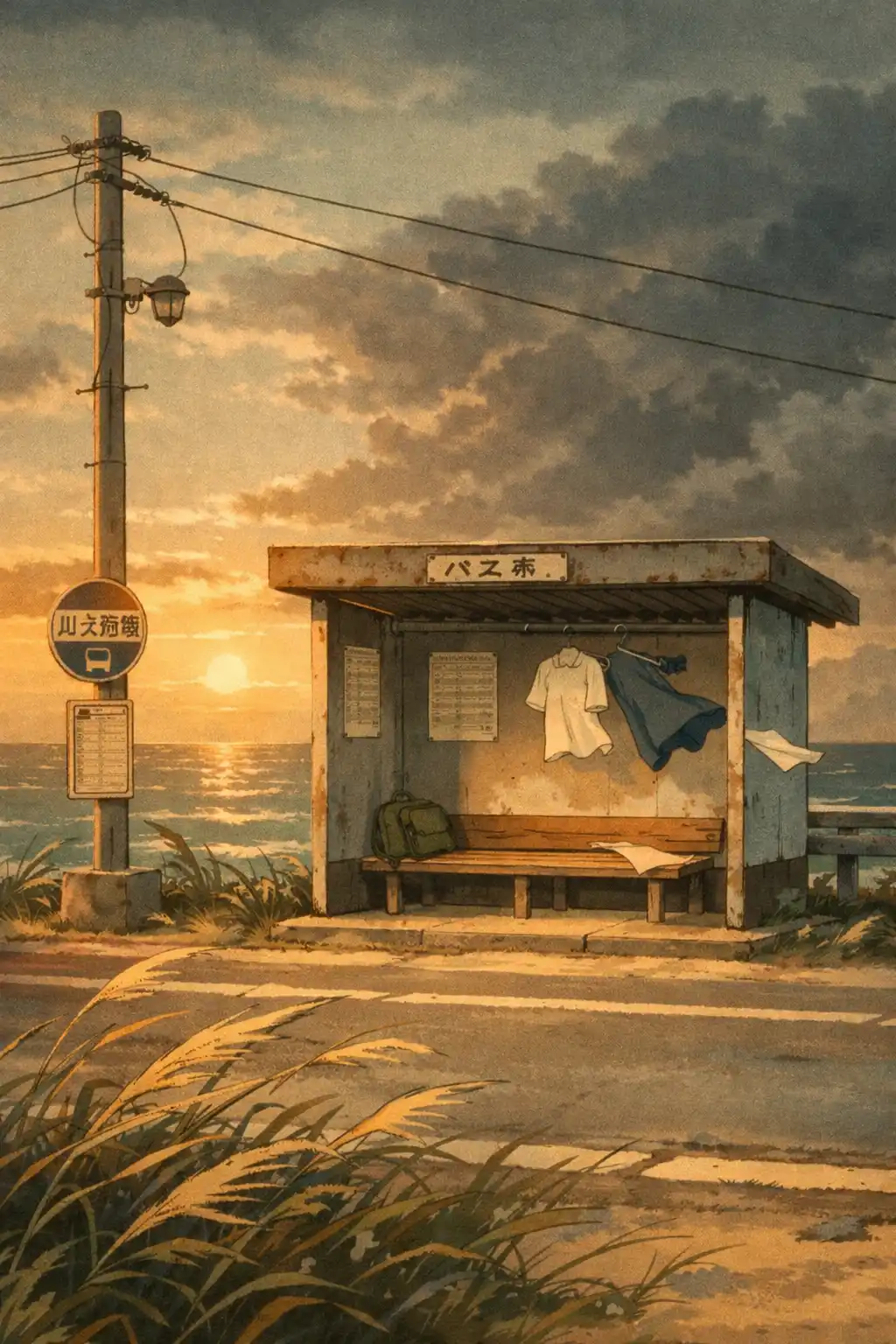 Anime retro style coastal bus stop before storm at golden hour, wind lifting clothing and grass naturally, distant ocean with atmospheric haze, muted turquoise and warm amber contrast, subtle lens flare at horizon, slightly faded color grading, cinematic calm-before-rain mood