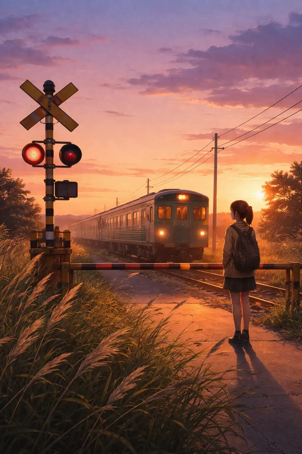 Anime retro style countryside train crossing at sunset, orange and lavender sky blending smoothly, slow-moving train in background, tall grass moving gently in warm wind, character waiting beside crossing gate, long cinematic shadows, pastel sky gradients, subtle film grain overlay, slightly faded saturation, calm reflective atmosphere Anime Retro Neon Alley Rain Prompt: