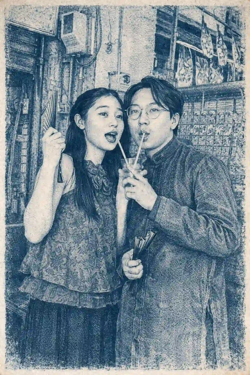 Once the image is uploaded, paste the prompt below and generate the result.Begin with [Uploaded Image] only as a visual reference for the person. Then reinterpret the subject as a completely hand-drawn Antique Portrait engraving from the 19th century. The final artwork must NOT look like a photograph or a photo filter. Instead, redraw the portrait entirely using pen-and-ink engraving techniques: fine linework, etched contours, and dense cross-hatching shading. Facial structure, hair, and clothing should be constructed from engraved ink strokes rather than photographic gradients. Next remove all photographic lighting, skin texture, and digital realism. Replace them with traditional illustration shading made of ink lines and engraved hatch marks. Then render the Antique Portrait artwork in monochrome cyanotype blue, resembling an antique scientific portrait plate printed on textured archival paper. Finally add subtle imperfections such as paper fibers, faded edges, and printing irregularities so the portrait looks like an authentic museum antique engraving rather than a modern digital image.