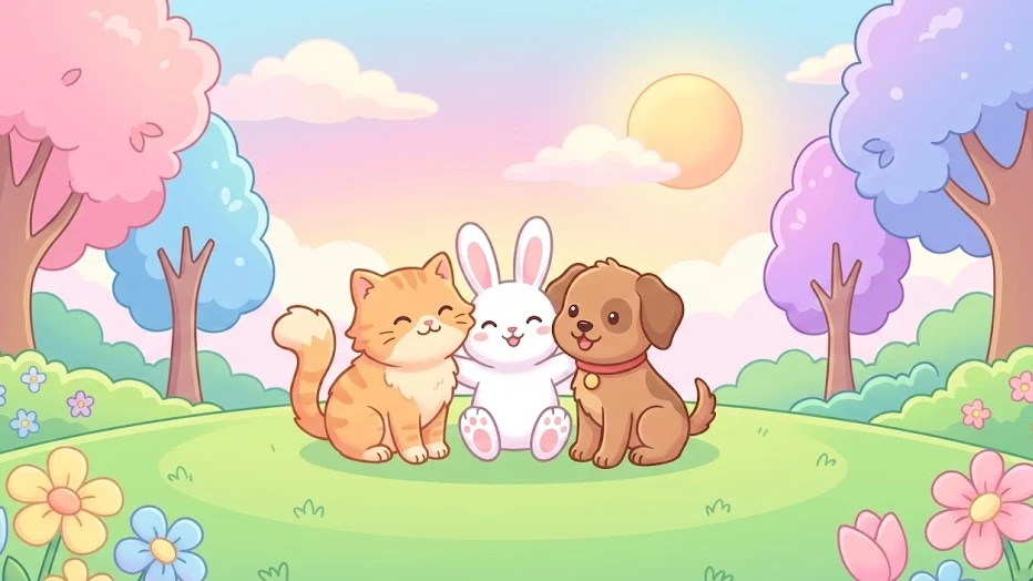 Cute YouTube banner showing cartoon cat, bunny, and puppy sitting together in a colorful park, pastel sky background, soft lighting, rounded shapes, friendly joyful mood — aspect ratio: <AR>