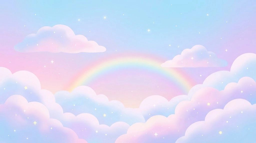 Cute YouTube banner featuring pastel sky filled with fluffy clouds, tiny stars, soft rainbow glow, dreamy atmosphere, minimal illustration style, smooth blended colors — aspect ratio: <AR>