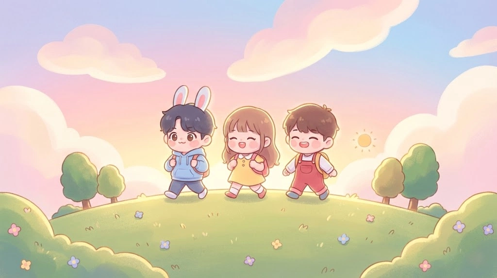 Cute YouTube banner with chibi-style characters walking on a grassy hill, pastel sky with fluffy clouds, soft sunlight glow, rounded shapes, playful illustration style, calm uncluttered layout — aspect ratio: <AR>