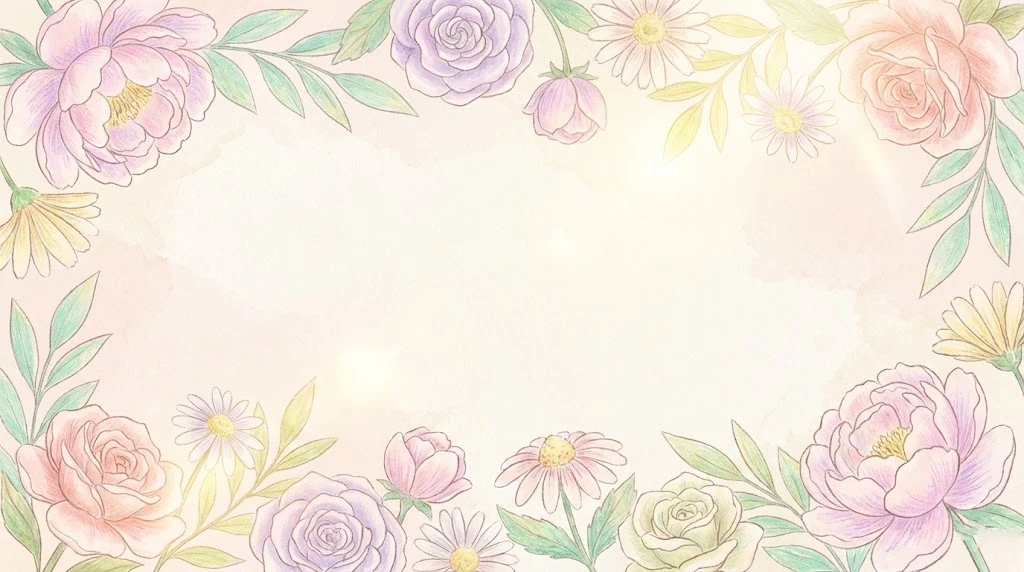 Cute YouTube banner with pastel flowers and gentle leaves across a light textured background, warm sunlight highlights, playful yet elegant illustration style, open center area — aspect ratio: <AR>