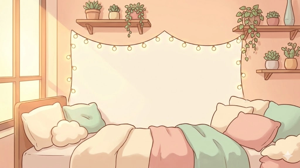Cute YouTube banner showing a cozy pastel bedroom with soft pillows, fairy lights glowing on the wall, small plants on shelves, warm sunlight through window, gentle cartoon illustration style, clean open space in center — aspect ratio: <AR>