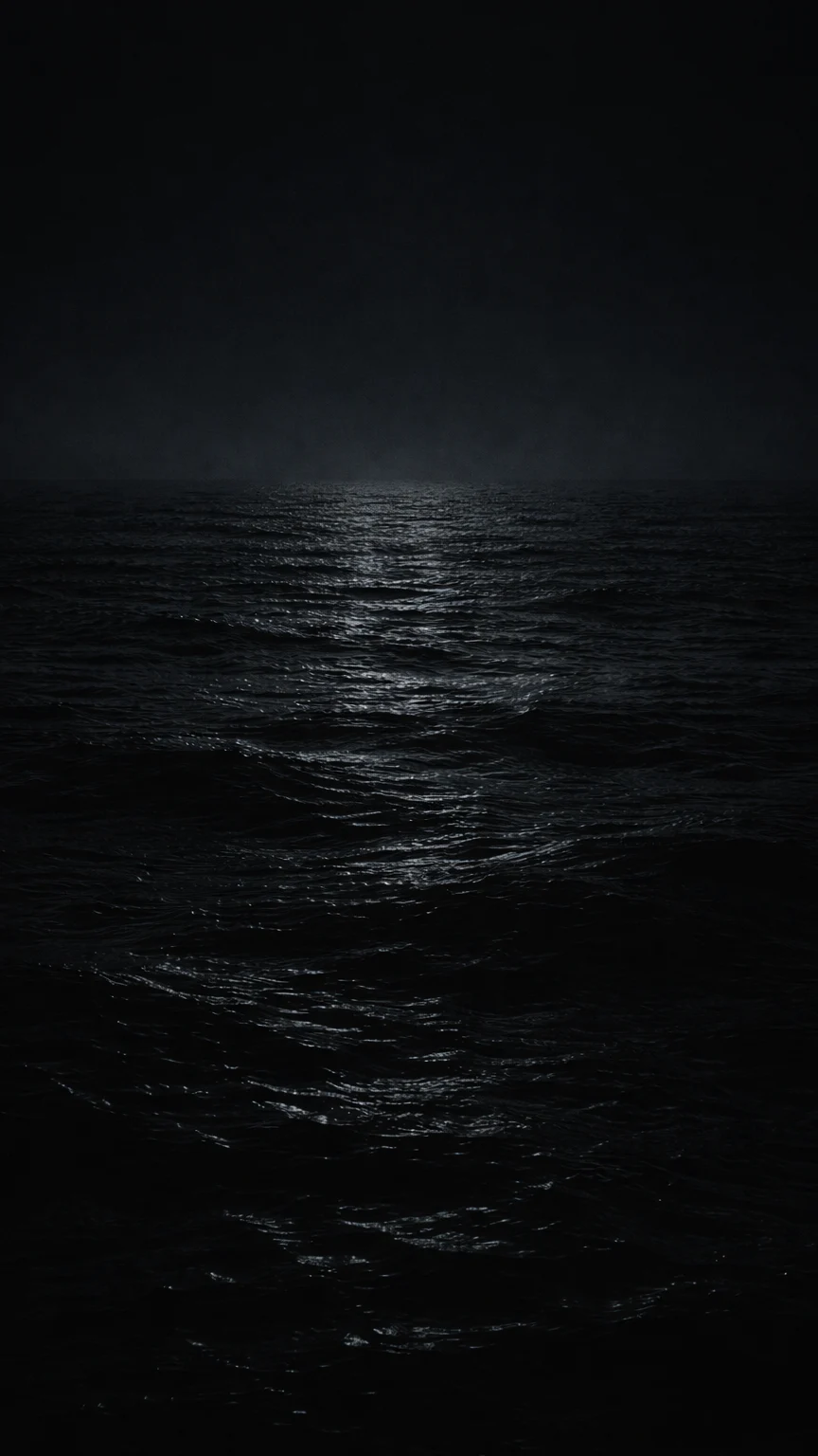 Vast dark ocean under near-black sky, faint moonlight reflecting softly across subtle wave patterns, horizon barely visible, deep tonal contrast, minimal composition, slow and calm visual rhythm Storm Over Mountain Range Prompt: