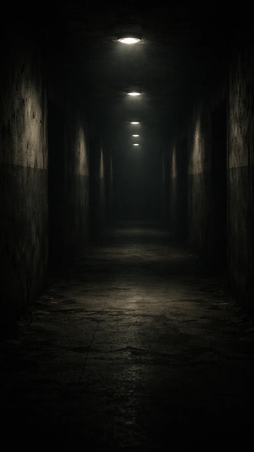Long empty corridor stretching into darkness, dim overhead lights spaced irregularly, soft light falloff between each source, deep shadows swallowing side walls, subtle fog thickening toward distance, worn concrete textures, strong linear perspective, cinematic depth, muted grayscale palette, quiet atmospheric tension Floating Monolith in Void Prompt:
