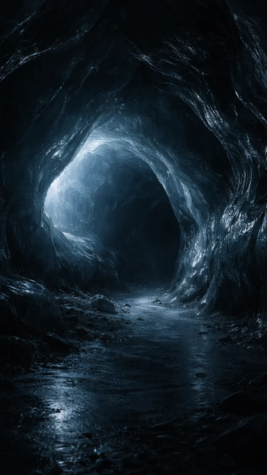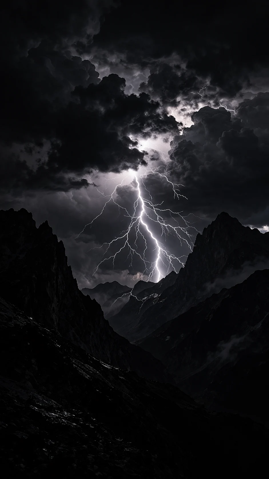 Pitch-black mountain silhouettes under heavy storm clouds, sudden lightning strike illuminating entire scene, sharp contrast between light and darkness, rugged terrain briefly revealed, cinematic freeze moment Frozen Cave Interior Prompt: