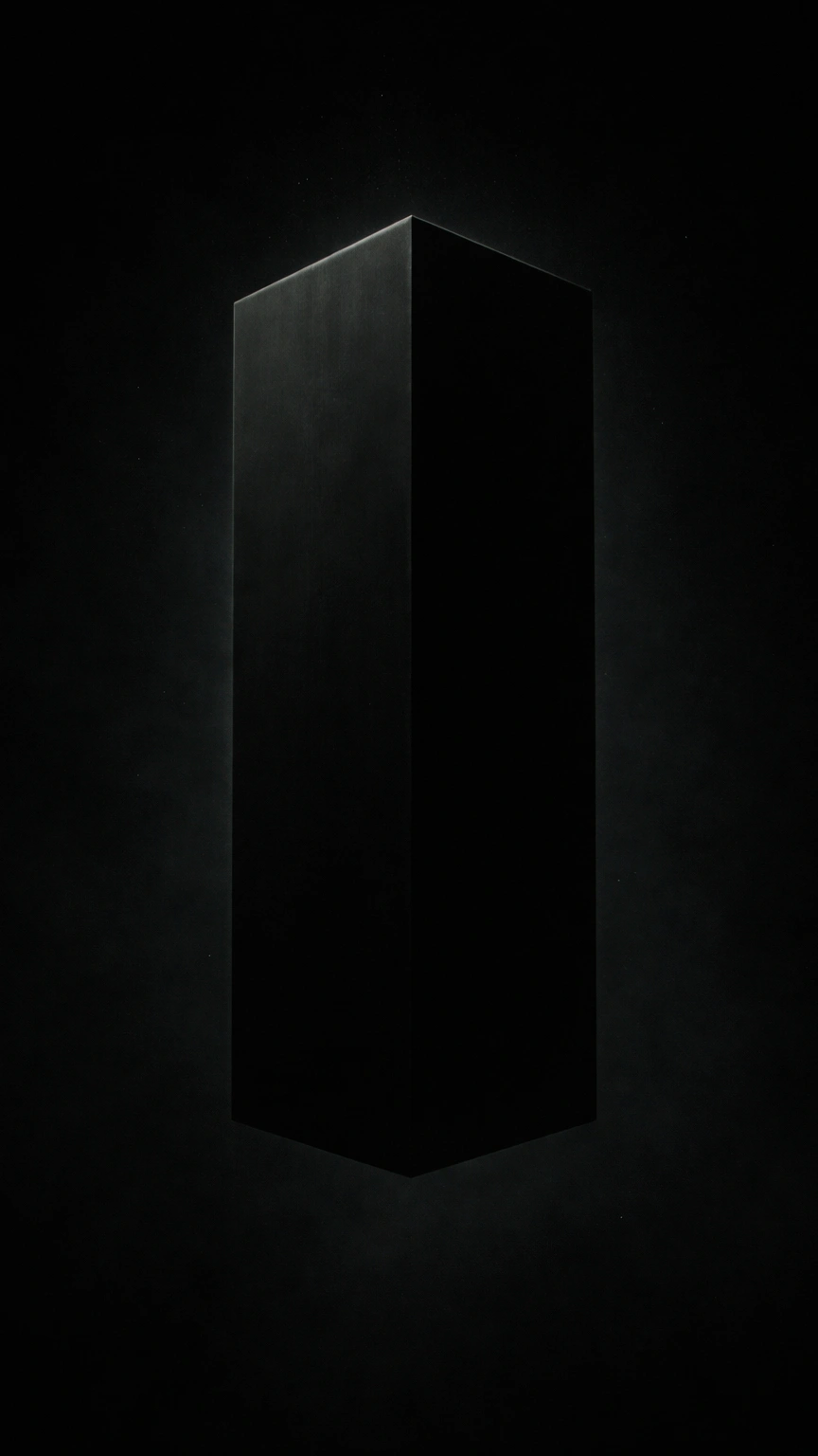 Massive matte black monolith suspended in infinite darkness, faint rim light outlining sharp edges, subtle dust particles drifting slowly, background completely black with slight depth haze, minimal composition, high contrast, mysterious and powerful presence Burning Forest Edge Prompt: