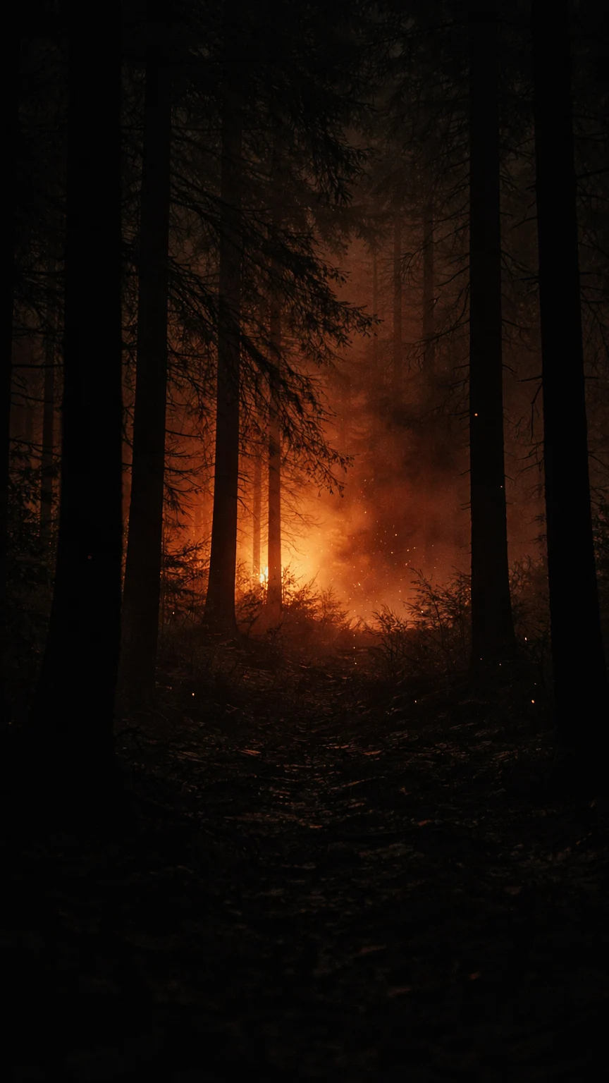 Dense forest at night with distant fire glow bleeding through tree silhouettes, warm orange light diffusing through smoke layers, foreground trees almost completely black, drifting embers with natural motion, textured ground faintly visible, strong warm vs dark contrast Minimal Gradient Horizon Prompt: