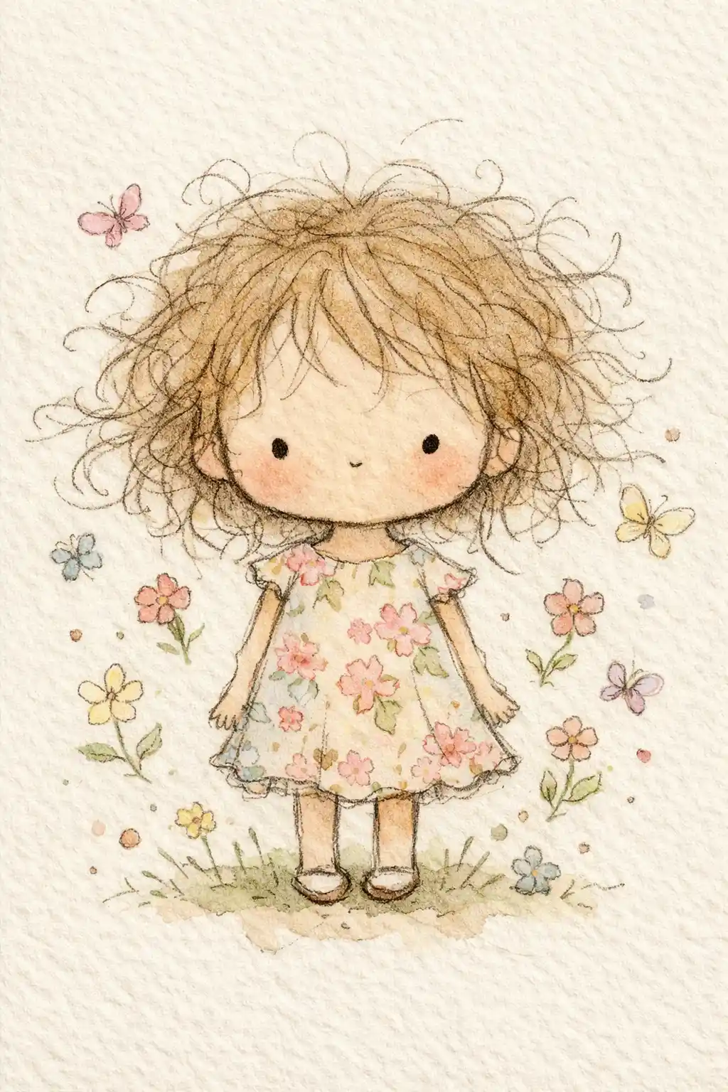 Prompt:Hand-drawn doodle girl illustration, whimsical watercolor nursery style, messy curly flyaway hair, big head small body proportions, tiny dot eyes, minimal facial features, wearing pastel floral dress, fine pencil doodle sketch lines, uneven imperfect hand-drawn linework, soft watercolor washes, visible watercolor paper texture, muted pastel colors, surrounded by tiny flowers and butterflies, dreamy vintage storybook aesthetic, handmade look, no vector, no digital smoothness