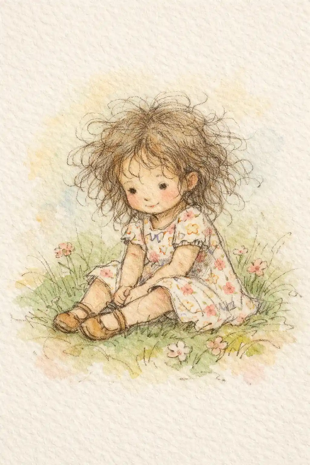 Prompt:Hand-drawn doodle girl sitting on grass, messy wild curly hair, floral dress, tiny shoes, fine pencil doodle sketch lines, watercolor pastel shading, visible pigment bleeding, watercolor paper grain texture, whimsical nursery illustration style, vintage children’s book aesthetic, delicate handmade appearance, no vector, no modern cartoon style