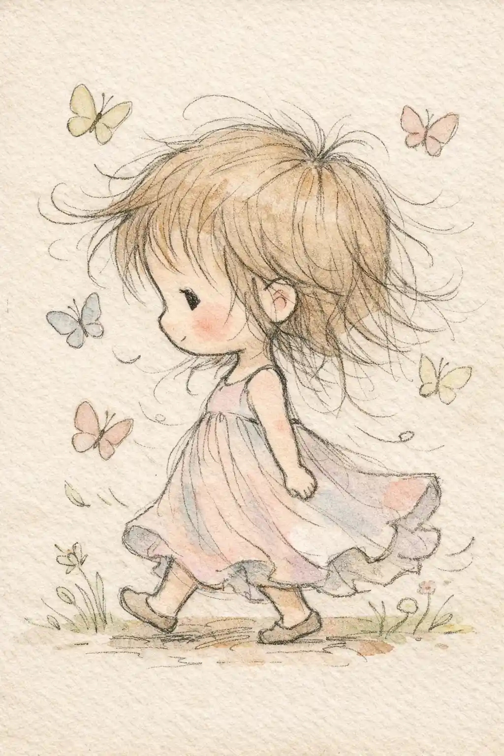 Prompt:Hand-drawn doodle girl walking, flowing pastel dress, messy flyaway hair strands, surrounded by butterflies, big head small body proportions, pencil doodle sketch linework, soft watercolor fill, pastel muted palette, visible paper texture, whimsical storybook nursery illustration, handmade aesthetic, no digital vector