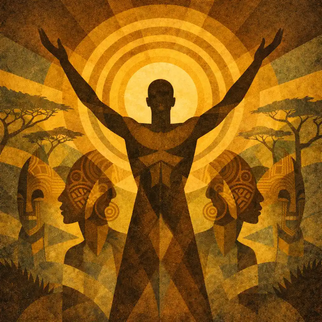 Harlem Renaissance art style, African ancestral symbolism, central silhouetted figure with raised arms in a powerful vertical composition, surrounded by radiating concentric halos, layered geometric patterns inspired by African motifs and masks, stylized trees integrated into flat planes, elongated proportions, minimal detail faces, strong contrast between light and dark layers, muted palette of deep brown, gold, olive, and faded blue, spiritual energy conveyed through repetition and symmetry, Art Deco structure fused with African heritage, textured matte canvas look, ultra detailed Harlem Nightlife Energy (Motley + Douglas Fusion) Prompt: