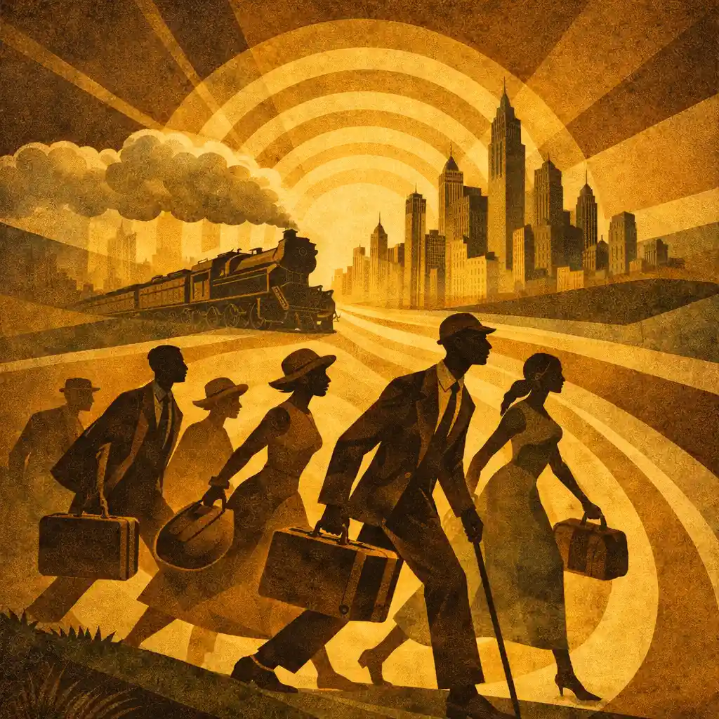 Harlem Renaissance art style, Great Migration theme, silhouetted African American figures moving in a directional flow toward a stylized northern city skyline, steam train integrated into composition with smoke transforming into concentric circular rays, layered visual storytelling from rural South to urban North, elongated bodies, faceless profiles, geometric abstraction, overlapping planes, Art Deco symmetry, limited earthy palette with gold accents, symbolic progression and hope, flat layered composition, vintage lithograph texture, historically grounded narrative, ultra detailed Ancestral & Spiritual Power Prompt: