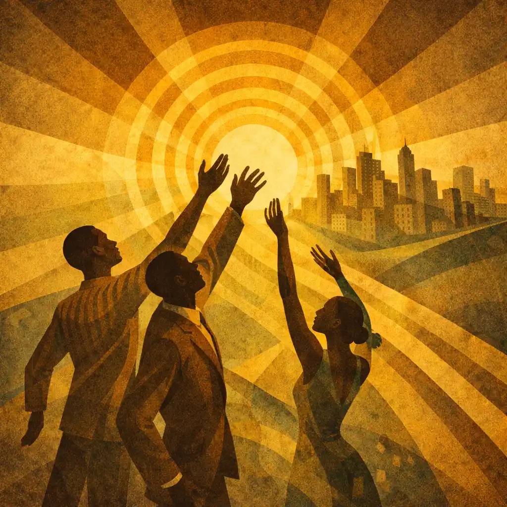 Harlem Renaissance art style, symbolic composition of hope and future progress, silhouetted figures reaching upward toward a rising sun formed by concentric golden circles, distant city skyline reduced to geometric blocks, strong diagonal upward movement, layered planes creating depth without realism, elongated forms, faceless profiles, limited muted palette with gold highlights, Art Deco influence, narrative of aspiration and liberation, flat layered structure, matte vintage finish, ultra detailed