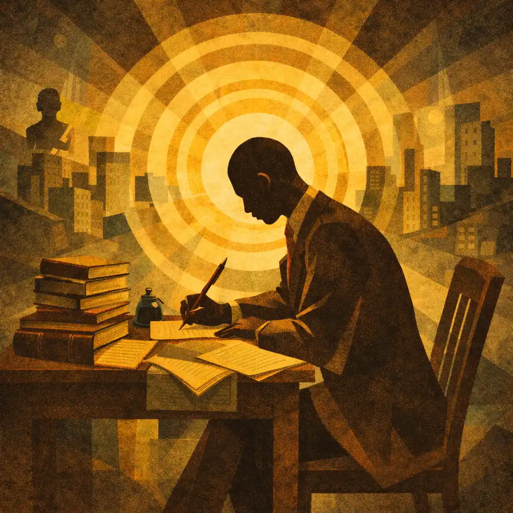 Harlem Renaissance art style, theme of Black intellectual and cultural awakening, silhouetted African American figure seated at desk with books and manuscripts, radiating concentric beams symbolizing knowledge and enlightenment, layered geometric background representing progress and modernity, elongated proportions, minimal facial features, muted scholarly palette of sepia, olive, charcoal, and gold, strong Art Deco symmetry, symbolic composition, flat design with depth through layering, vintage print texture, narrative of education and empowerment, ultra detailed Hope, Freedom & Future Vision Prompt: