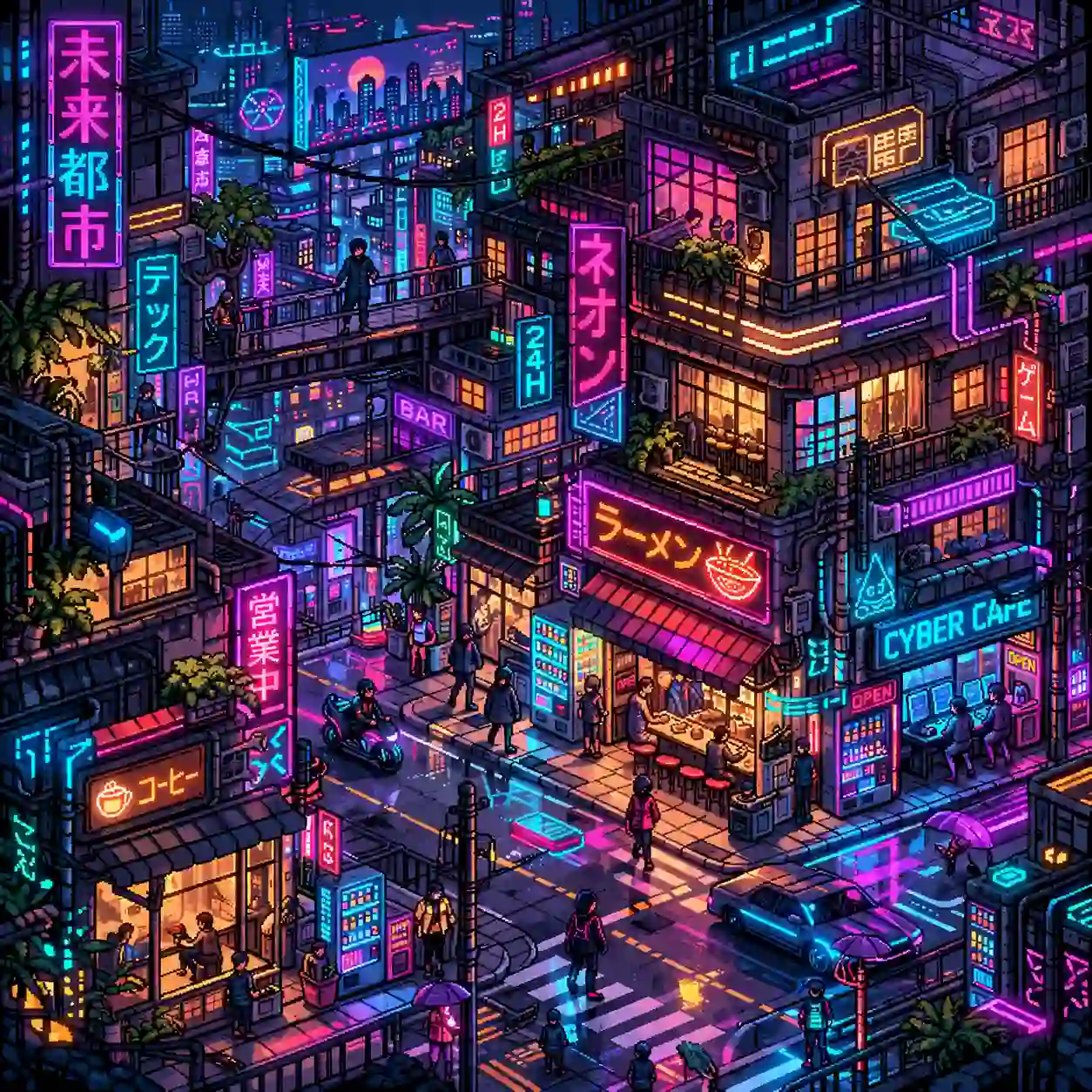 Create an isometric pixel art cyberpunk street scene with neon signs, glowing windows, layered buildings, reflective surfaces, consistent light direction, deep shadows between structures, vibrant but controlled color palette, dense environment detail, clean pixel precision, aspect ratio [AR] Isometric Pixel Art Cozy Room Prompt:
