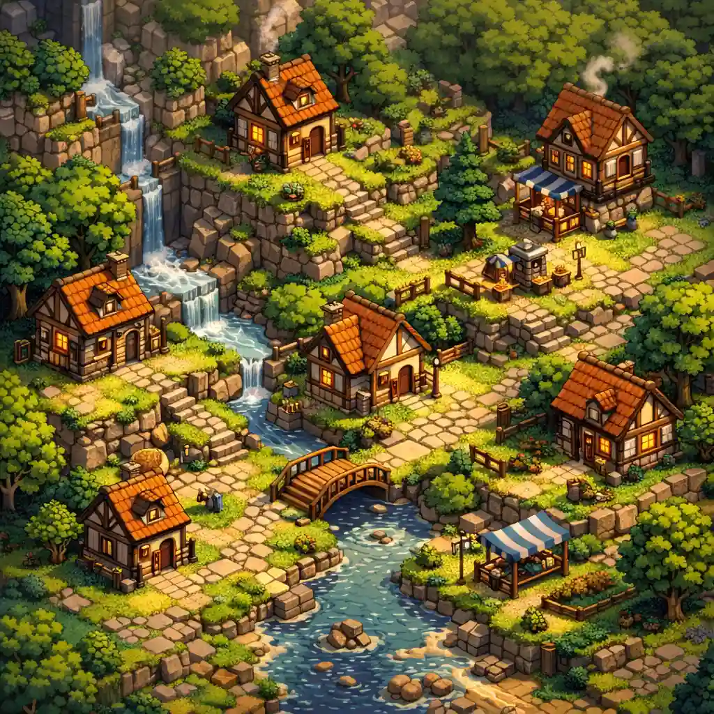 Create an isometric pixel art medieval village with small houses, stone paths, trees, and water elements, layered terrain depth, consistent lighting direction, shadows defining elevation, earthy color palette, detailed environment, clean pixel structure, aspect ratio [AR] Isometric Pixel Art Industrial Factory Prompt: