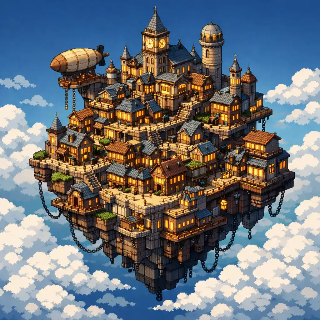 Create an isometric pixel art floating city suspended in the sky, detailed buildings stacked in layered depth, tiny streets and glowing windows, soft directional lighting from top-left, clean pixel grid alignment, subtle shadow casting between structures, atmospheric clouds below, high detail, crisp edges, aspect ratio [AR] Isometric Pixel Art Cyberpunk District Prompt: