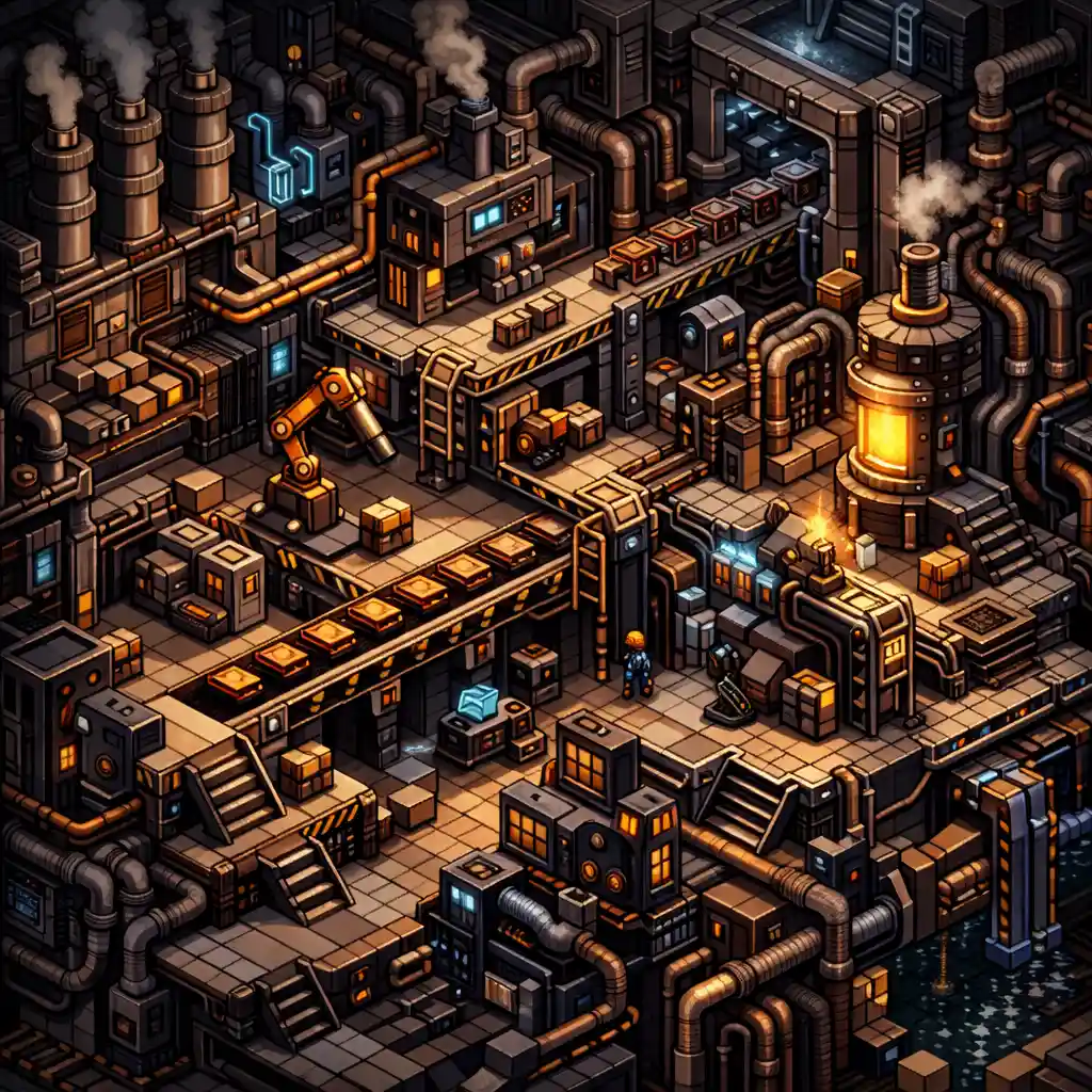 Create an isometric pixel art industrial factory scene with pipes, machinery, conveyor belts, and layered platforms, strong geometric structure, metallic tones, controlled lighting with sharp shadows, dense mechanical detail, clean pixel alignment, aspect ratio [AR] Isometric Pixel Art Nature Landscape Prompt: