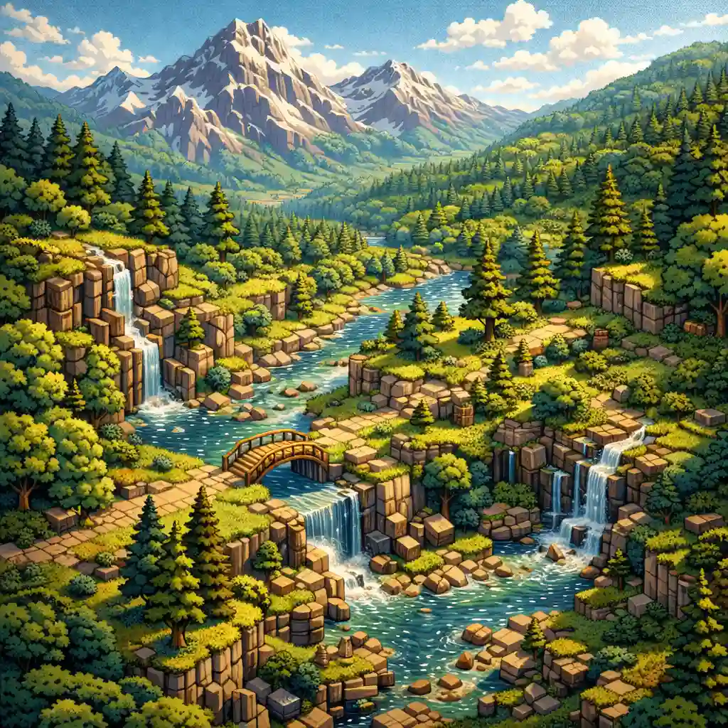 Create an isometric pixel art natural landscape with mountains, rivers, trees, and layered terrain, soft lighting from one direction, shadows defining elevation changes, balanced color tones, peaceful environment, crisp pixel detail, aspect ratio [AR]