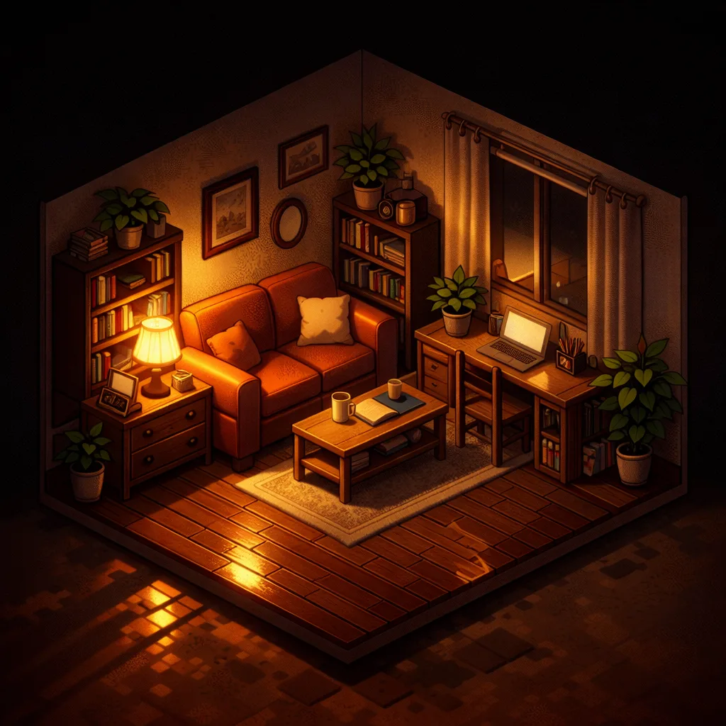 Create an isometric pixel art interior of a cozy room, small furniture arranged neatly, warm lighting from a single source, soft shadows falling diagonally, detailed objects like books, plants, and lamps, clean grid perspective, calm and balanced composition, aspect ratio [AR] Isometric Pixel Art Fantasy Village Prompt: