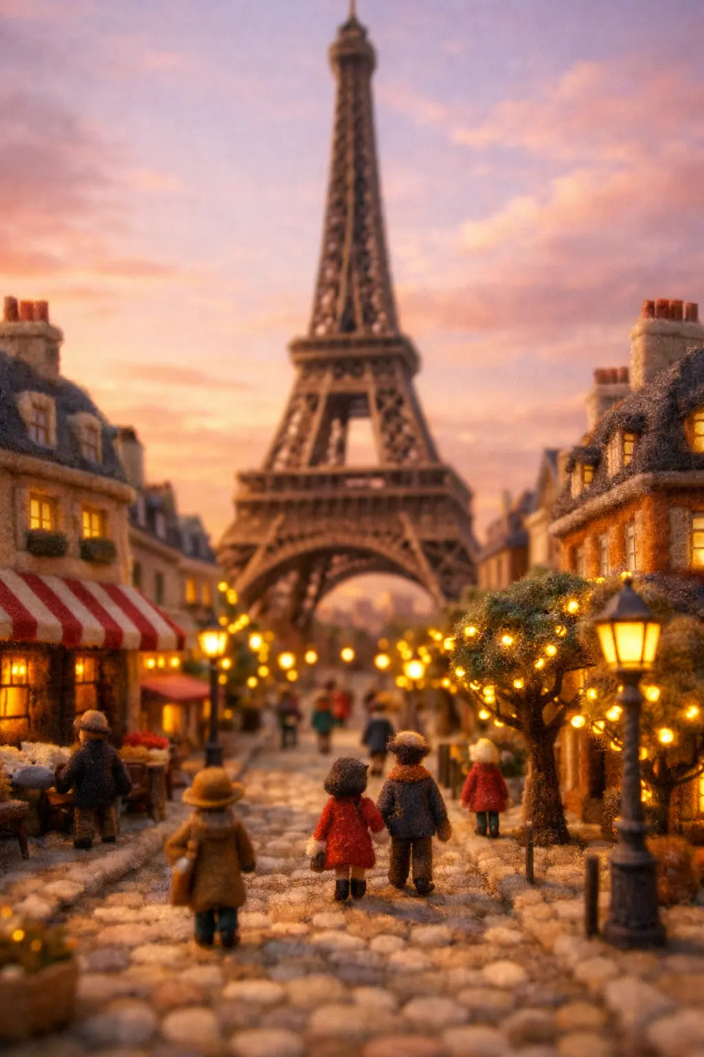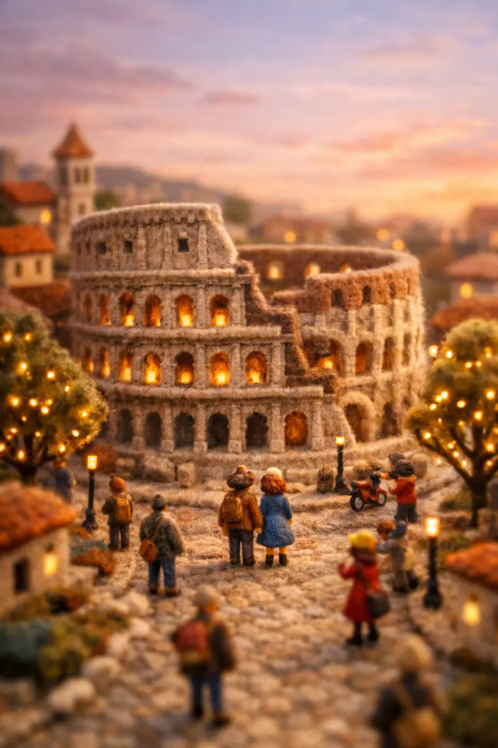Animate the uploaded image as a cinematic miniature felt-craft diorama of {FAMOUS_LOCATION}, {CITY_NAME}, {COUNTRY}. Preserve the original image composition, scale, and handcrafted wool textures exactly as shown. The environment remains stable like a physical miniature model. A tilt-shift macro camera performs a very slow, smooth forward glide through the miniature city scene. Subtle natural motion appears: small figurines walk gently along the streets while fairy lights softly glow on the trees. Warm golden-hour lighting slowly shifts across the tiny buildings, maintaining a cozy cinematic atmosphere with shallow depth of field and realistic miniature scale.