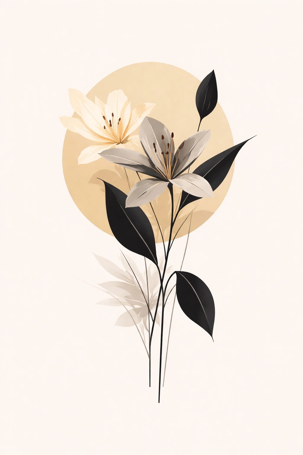 Minimalist botanical vector poster, elegant cream flower with flat petal shading, muted warm beige and charcoal palette, soft circular background shape, bold negative space, clean stem and leaf silhouettes, subtle shadow layering, smooth gradient disk behind subject, modern art print aesthetic, no texture grain, flat graphic style, balanced composition, Scandinavian-inspired minimal poster design, ultra-clean vector artwork, 4K Vibrant Bird & Sun Graphic Poster Prompt: