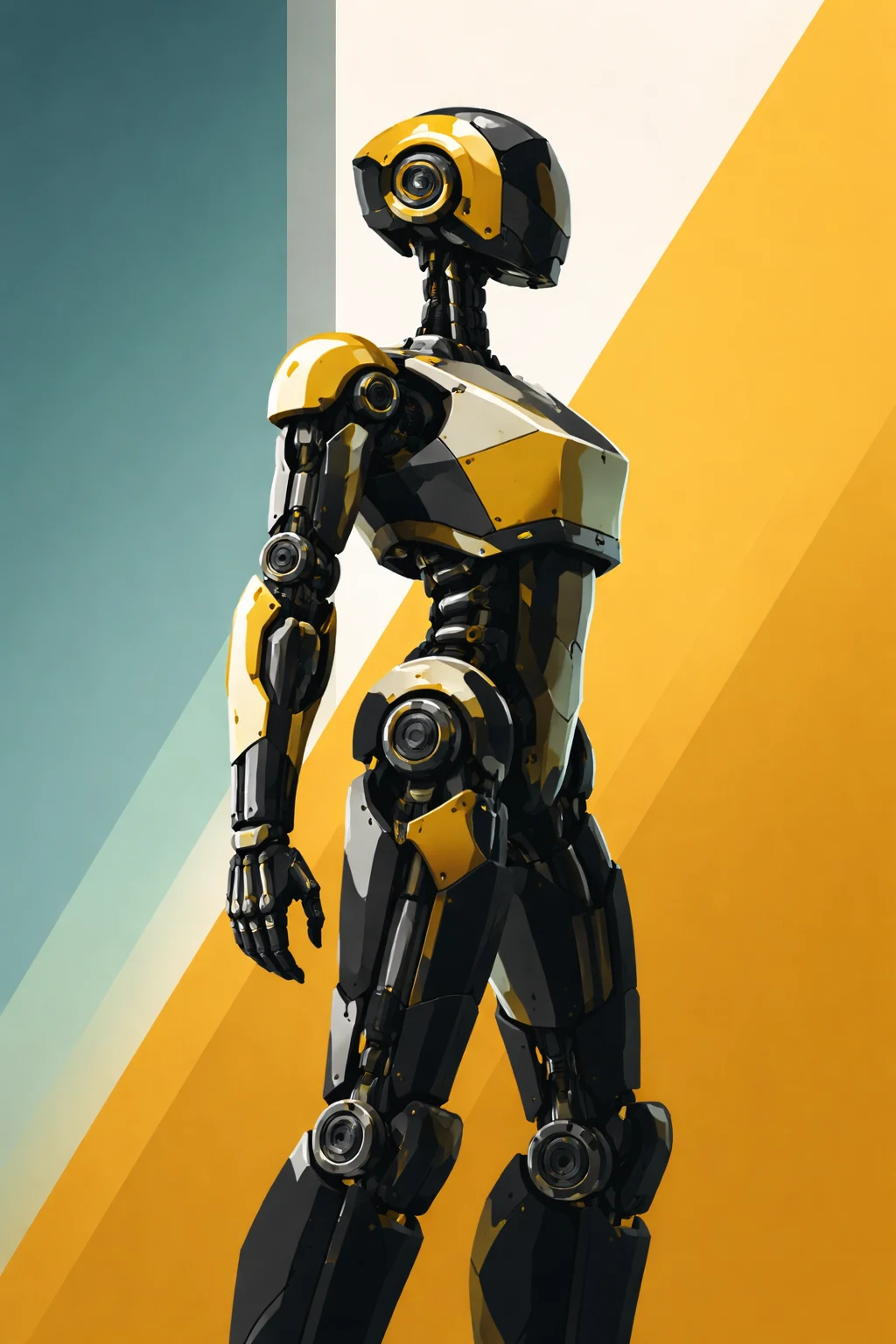 Minimalist vector poster of a humanoid robot standing upright, angular mechanical armor plates, bold mustard yellow and charcoal color palette, flat geometric shading, high-contrast shadow segmentation, smooth gradient background split diagonally, clean vector precision, no surface texture, modern sci-fi editorial art style, centered composition, strong silhouette clarity, poster-ready layout, ultra-clean 4K graphic illustration