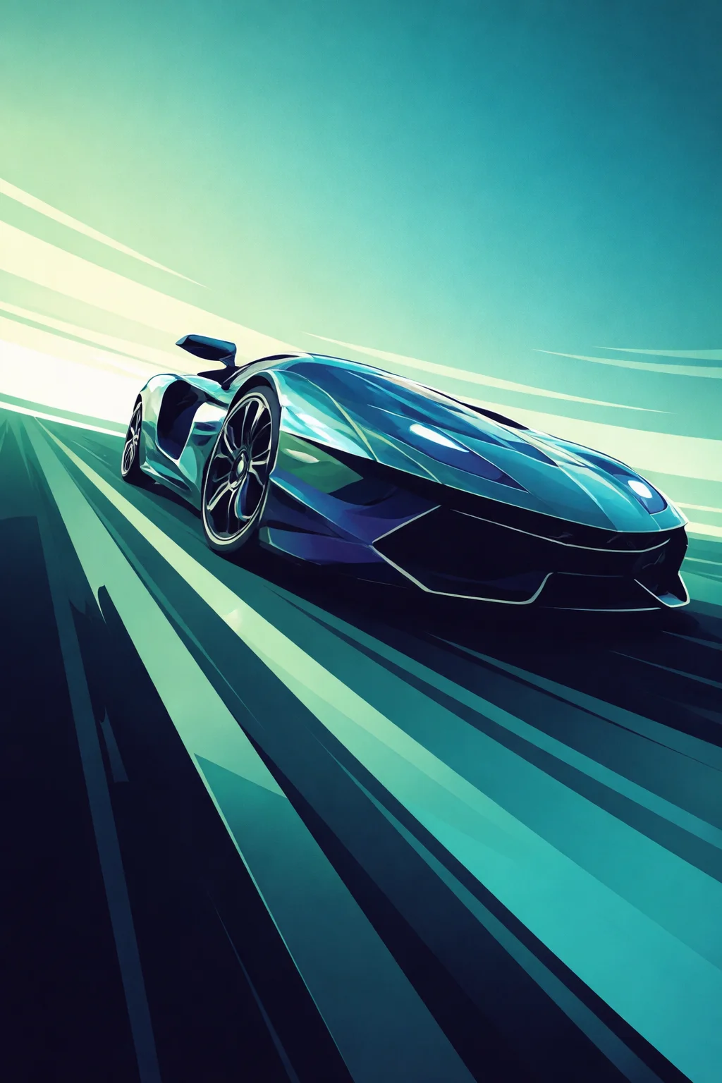 Minimalist vector poster of a futuristic hypercar speeding forward, dynamic perspective angle, elongated motion lines, teal and emerald gradient highway streaks, deep shadow undercarriage, clean polygonal reflections, sharp geometric body panels, high-contrast lighting, smooth flat color transitions, no textures, bold color blocking, modern automotive editorial poster style, centered composition, sleek and aerodynamic energy, ultra-clean vector finish, 4K Monochrome City Reflection Poster Prompt: