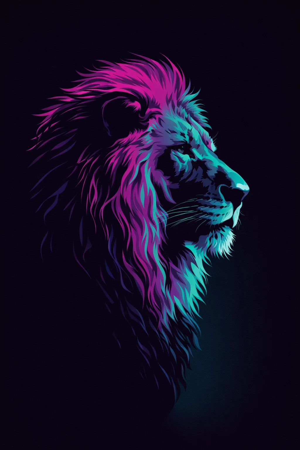 Minimalistic vector poster of a majestic lion side profile, sharp silhouette edges, ultra-clean geometric composition, bold teal-to-magenta gradient lighting, dark negative background, high contrast rim light defining mane strands, smooth flat shading, no texture noise, modern graphic design aesthetic, centered subject, cinematic color blocking, crisp vector edges, posterized shadows, contemporary gallery print style, 4K, ultra-clean, no realism, pure flat illustration Futuristic Supercar Motion Poster Prompt: