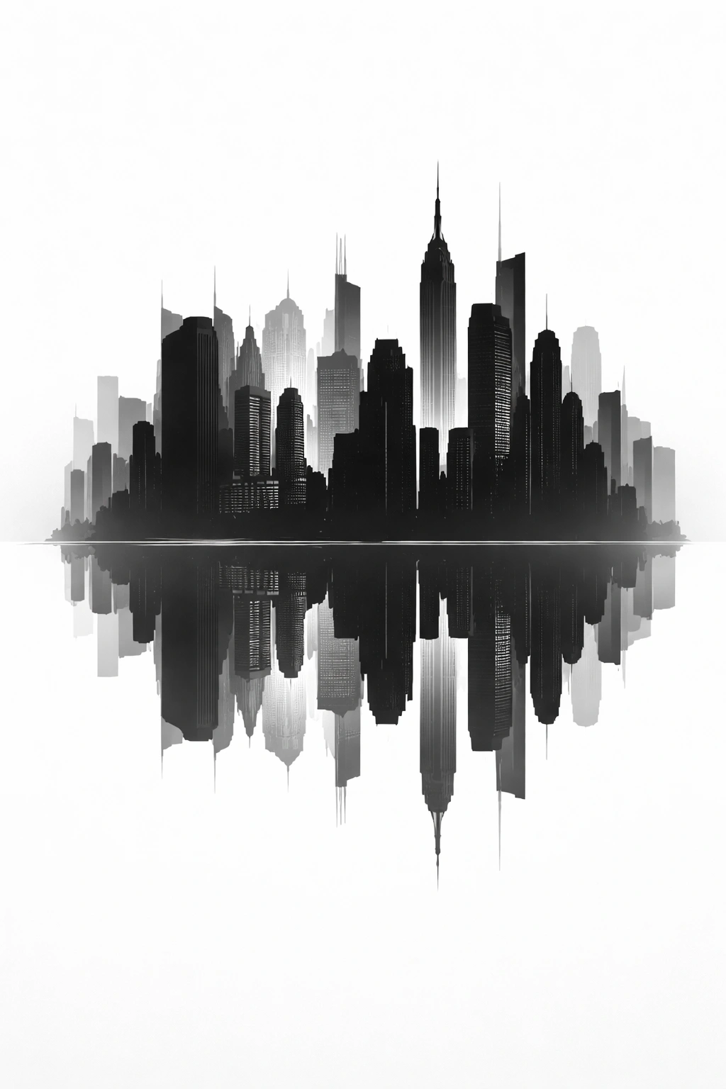 Minimalistic black and white vector skyline poster, mirrored city reflection below, symmetrical composition, strong vertical silhouettes, high contrast grayscale palette, clean negative space, sharp architectural outlines, flat shadow blocks, modern urban art print style, no gradients except subtle fog fade, crisp vector precision, poster-ready layout, balanced geometric spacing, ultra-clean finish, contemporary minimalist aesthetic Botanical Minimal Floral Poster Prompt: