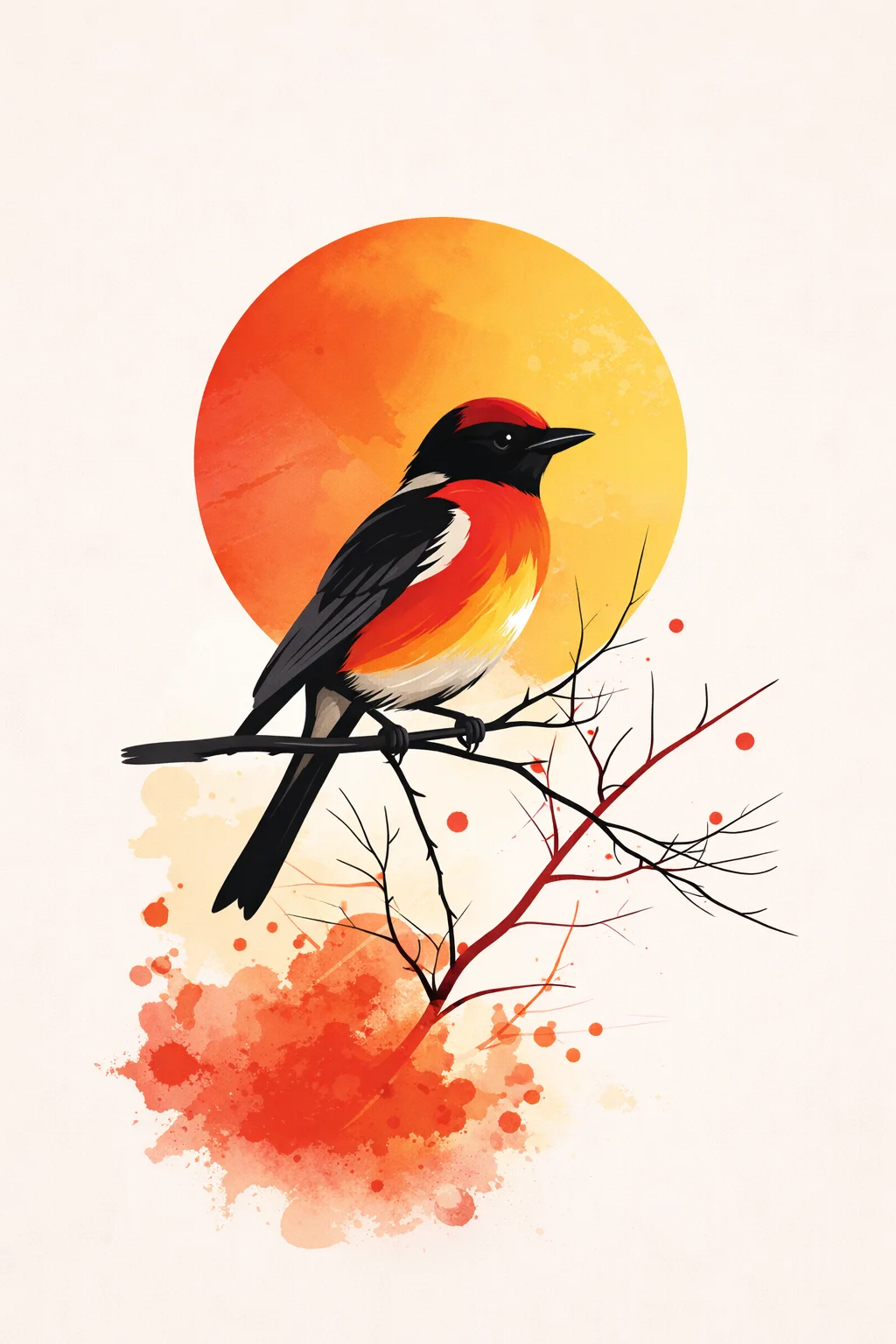 Minimalistic vector poster of a perched songbird with bold red and yellow plumage, large flat circular sun backdrop in warm gradient orange tones, thin branch silhouettes, strong contrast shadows, clean geometric layering, soft paint-splash accents but fully vector controlled, centered composition, smooth flat shading, high saturation color blocking, contemporary wall art style, no realism, crisp edges, modern minimalist illustration, 4K resolution Futuristic Robot Editorial Poster Prompt: