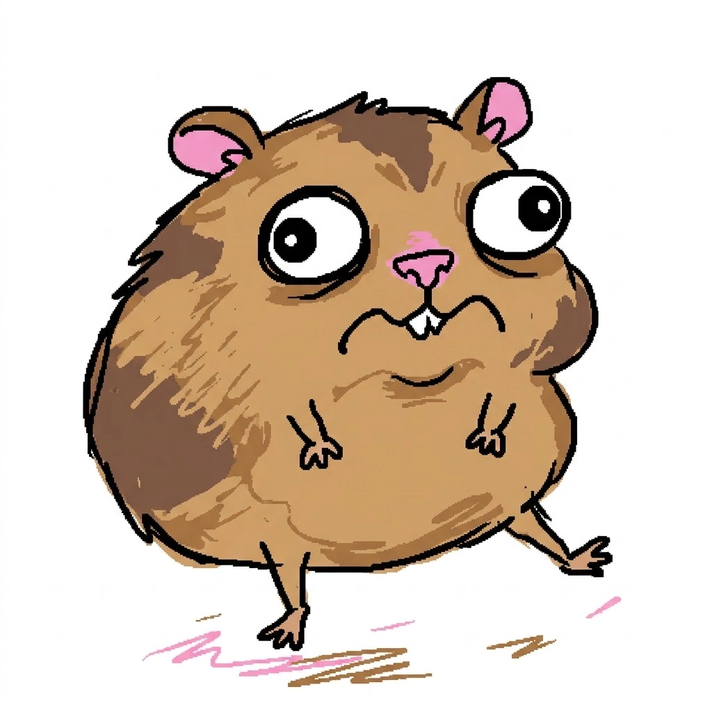 Badly drawn hamster in MS Paint style, round distorted body, tiny limbs, uneven outlines, flat colors, awkward facial expression, goofy and cursed meme energy, simple white background, intentionally crude and funny drawing Tired / Dead Inside MS Paint Meme Prompt: