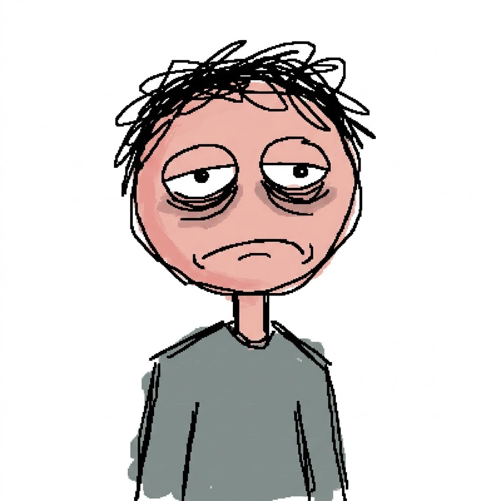 Crude MS Paint character with tired eyes and blank expression, droopy face, uneven sketchy lines, flat dull colors, messy outlines, low effort drawing style, emotionless and relatable meme vibe, white background