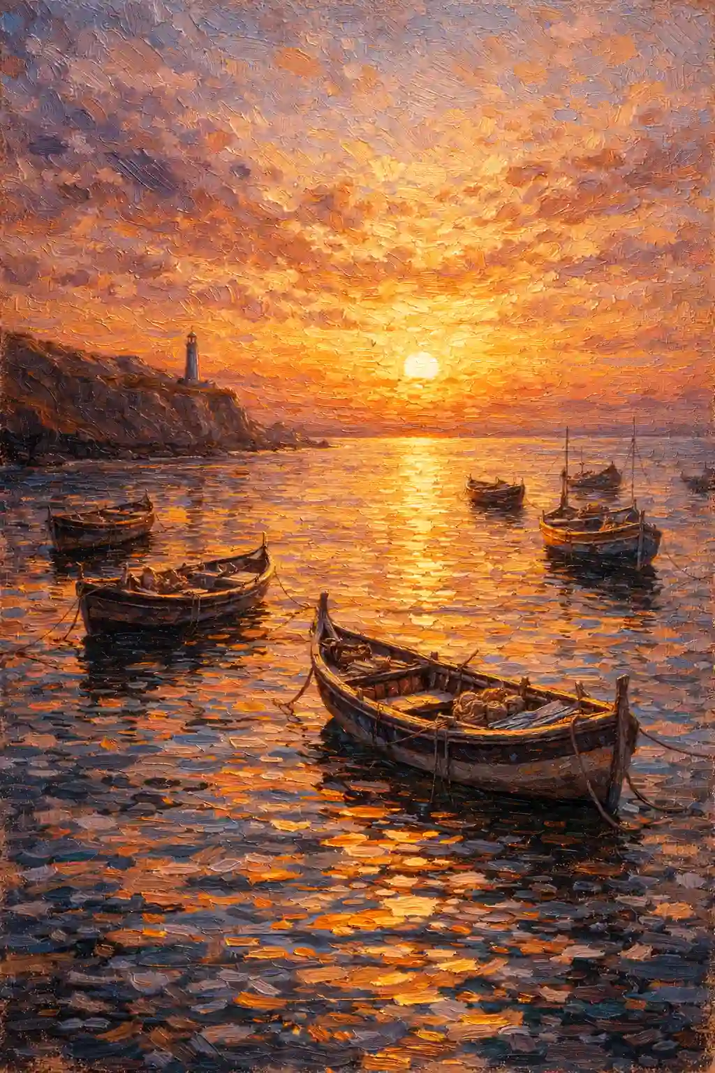 Atmospheric oil painting landscape of a peaceful coastal harbor filled with wooden fishing boats gently floating on calm water. A glowing sunset spreads warm orange and pink hues across the sky while a lighthouse stands on distant cliffs. Palette knife strokes create shimmering water reflections and dramatic sky textures. Desert Caravan Journey Prompt: