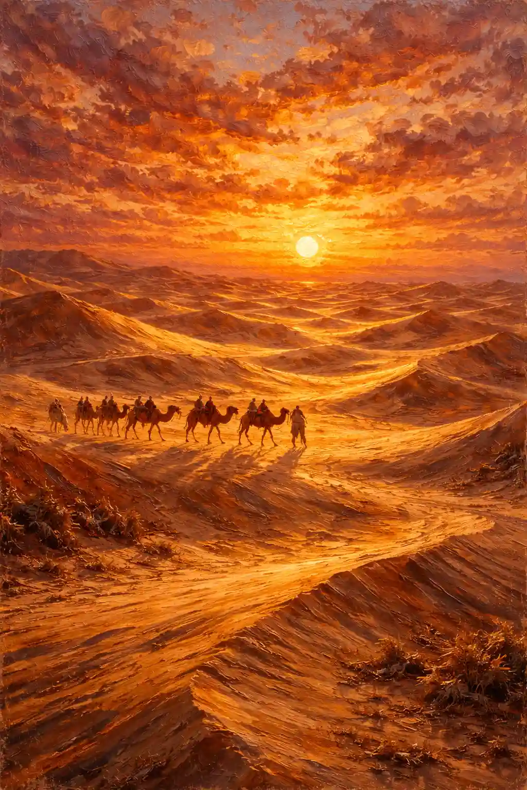 Cinematic oil painting landscape showing a vast desert with rolling golden dunes stretching toward the horizon. A caravan of camels travels slowly across the sand while a dramatic sunset fills the sky with deep orange and crimson colors. Thick textured paint strokes capture the movement of wind across the dunes. Historic Castle Landscape Prompt: