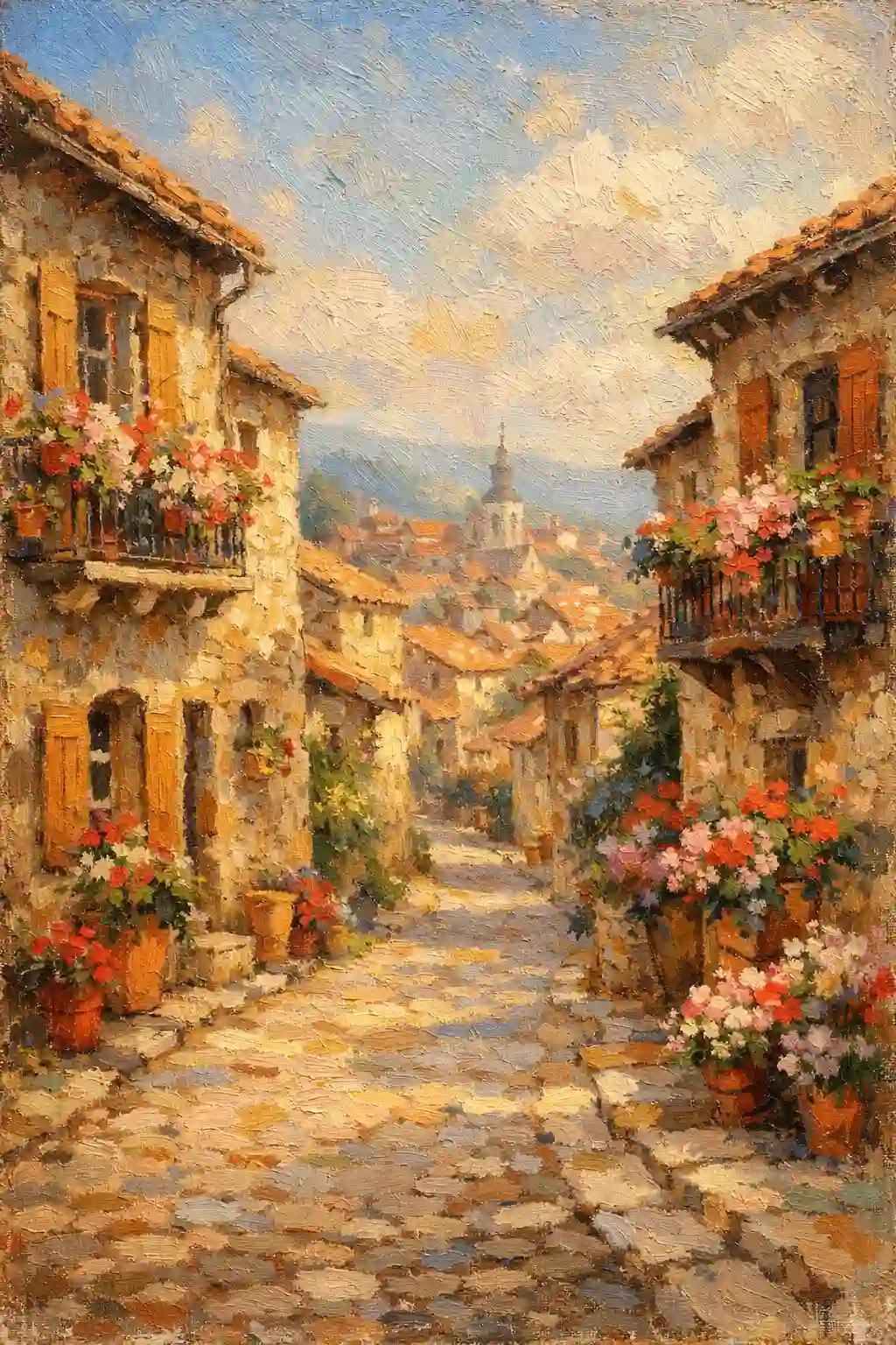 Impressionist oil painting landscape of a charming European village with narrow cobblestone streets lined with old stone houses, wooden shutters, and flower-covered balconies. Warm afternoon sunlight casts soft shadows along the road while distant rooftops fade into atmospheric haze. Thick expressive brush strokes, rich oil paint layers, textured canvas surface, pastel color harmony, classical gallery-style artwork. Venice Canal Sunset Prompt: