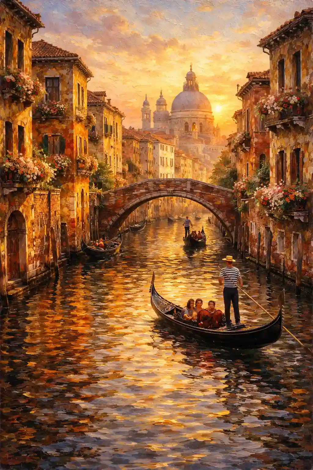 Romantic oil painting landscape depicting a quiet Venetian canal surrounded by historic buildings with colorful facades and arched bridges. Gondolas drift slowly across reflective water while golden sunset light illuminates the scene. Painterly reflections ripple across the canal, impressionist brushwork blends warm tones, thick layered oil paint texture creates depth and elegance. Coastal Harbor Evening Prompt: