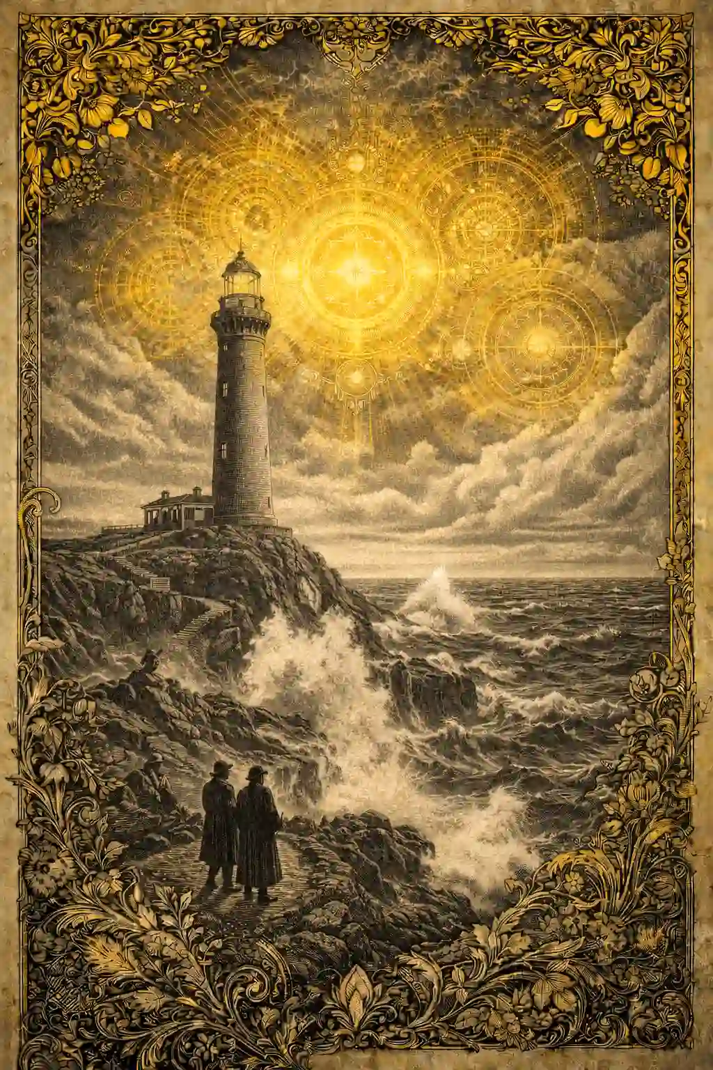 Highly detailed ornamental collage artwork of a tall lighthouse standing on a dramatic rocky coastline as powerful ocean waves crash below. The sea, cliffs, and lighthouse architecture are illustrated in monochrome graphite engraving style with intricate etched textures and antique print shading. Two figures stand along a coastal path watching the stormy ocean. Above the lighthouse, massive celestial mandalas and navigational diagrams spread across the sky in luminous mustard-gold ornamentation, resembling ancient star charts guiding sailors. The background features layered parchment textures, decorative borders, and botanical engraving elements integrated into the composition. The limited palette of grey and gold creates a striking contrast, while ultra-detailed linework and baroque ornamental design give the image a museum-quality vintage aesthetic.
