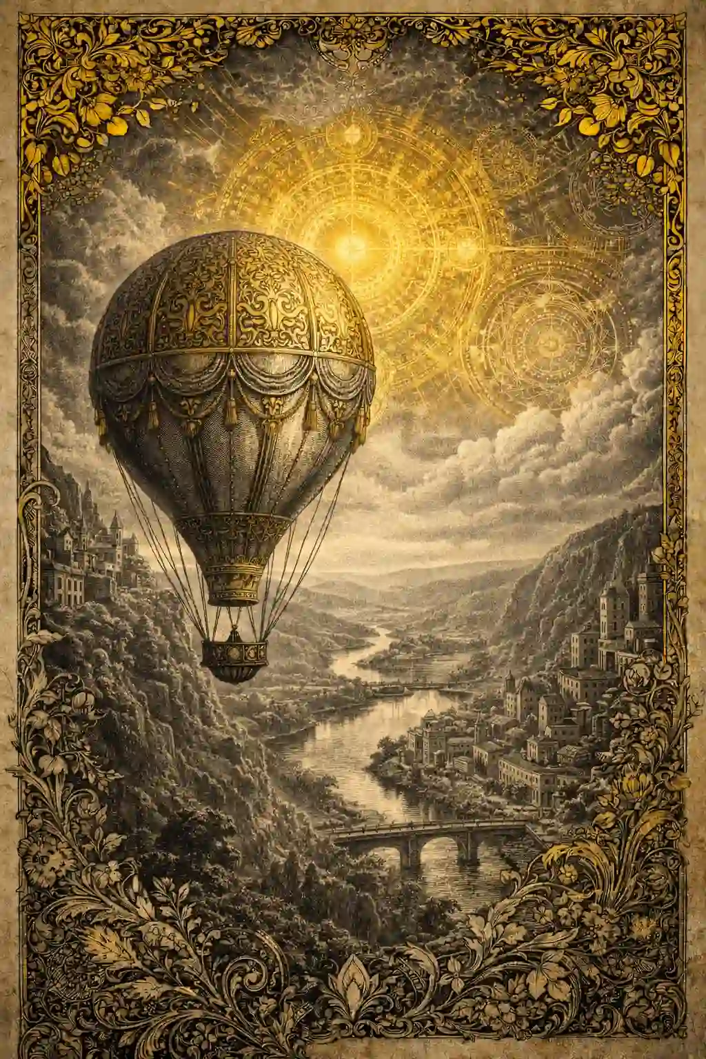 Surreal ornamental vintage collage showing a majestic hot air balloon floating above a winding river valley filled with classical architecture and engraved forests. The entire landscape is illustrated in monochrome charcoal etching style, with finely detailed linework defining hills, bridges, buildings, and water reflections. The balloon itself is decorated with ornate Victorian filigree patterns and textile panels highlighted in mustard gold. The sky is layered with celestial mandala diagrams, antique navigation charts, and circular ornamental geometry radiating behind the balloon. Subtle parchment textures and botanical motifs blend into the composition, giving the piece an antique atlas aesthetic. Limited two-tone palette of grayscale and gold creates a dramatic contrast, with ultra-detailed engraving lines and a richly decorative baroque composition. Ornamental Monument Plaza Prompt: