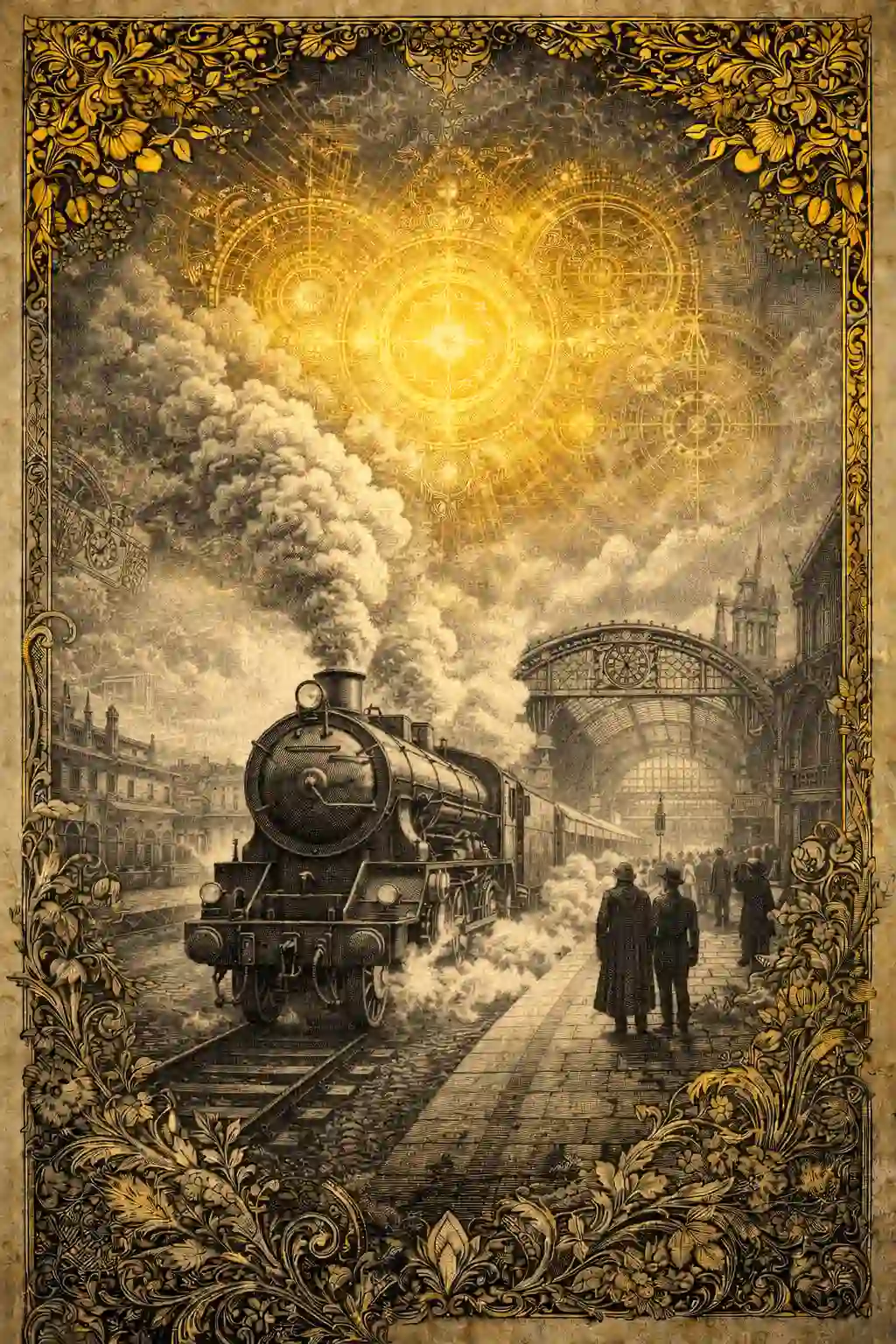 Victorian ornamental collage illustration of a powerful vintage steam locomotive arriving at a grand old railway station. The train, tracks, and surrounding architecture are illustrated in monochrome charcoal engraving style with intricate mechanical detailing and etched shading. Thick clouds of steam rise from the locomotive and transform into elaborate ornamental patterns in the sky. Above the station, celestial mandalas and antique engineering diagrams appear in glowing mustard-gold decoration, creating a surreal fusion of technology and sacred geometry. Passengers dressed in early twentieth-century clothing stand along the platform. Layered parchment textures, decorative borders, and botanical engravings enrich the background. The composition feels like an antique travel poster enhanced with extremely detailed baroque ornamentation. Ornamental Coastal Lighthouse Scene Prompt: