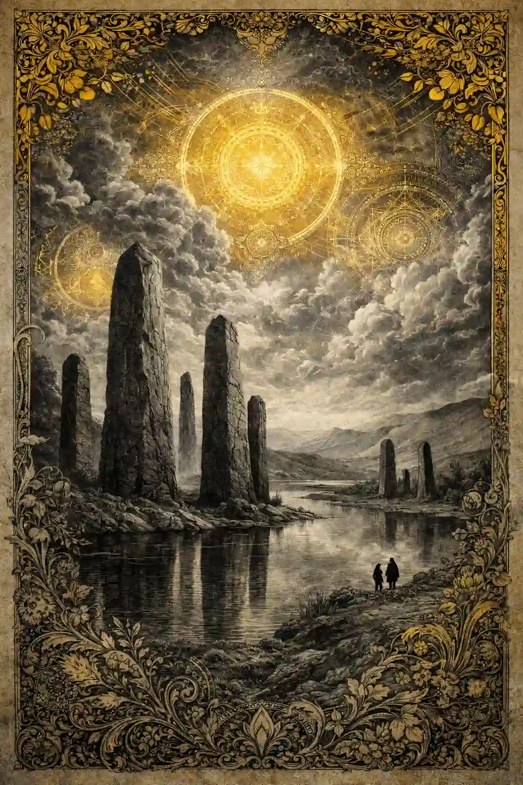 Victorian ornamental collage illustration of towering ancient standing stones rising beside a calm river valley, with two small travelers observing the mysterious formation. The landscape is rendered in monochrome charcoal and graphite engraving style with detailed etched textures on rocks, water, and distant hills. Above the scene, a dramatic celestial sky filled with intricate mandala engravings and sacred geometry diagrams spreads outward like a radiant halo. The entire environment uses muted grayscale tones, while selective mustard-gold ornamental overlays highlight the sky patterns and decorative borders. Antique parchment textures, botanical filigree elements, and layered collage details create a rich vintage atlas aesthetic. Ultra-detailed etching linework, baroque decorative composition, museum-quality ornamental illustration. Ornamental Ancient City Portal Prompt: