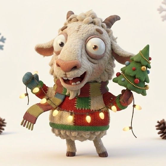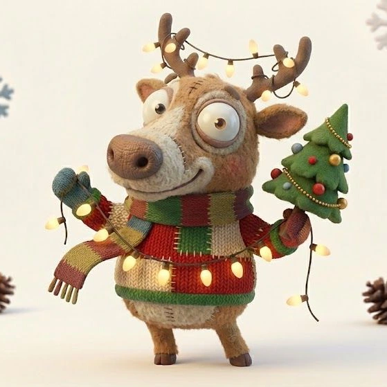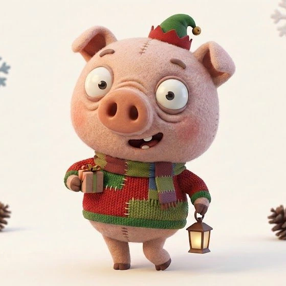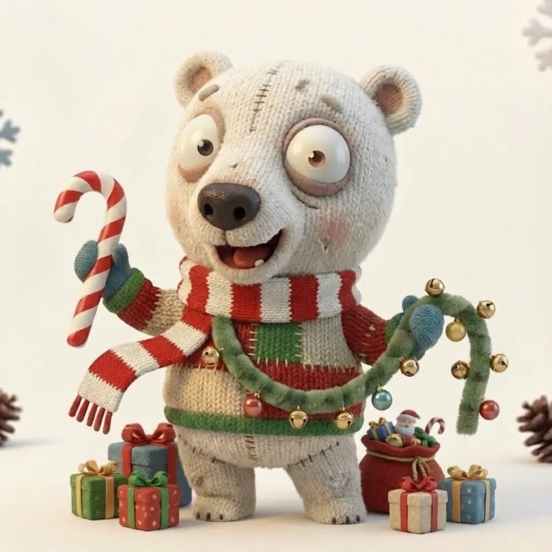 { "subject": "A quirky anthropomorphic [animal type] character in a Christmas theme with human-like posture and behavior", "character_style": "Highly stylized 3D character with exaggerated proportions and expressive facial features", "face_design": "Large expressive eyes, slight asymmetry, oversized animal snout, visible teeth, soft wrinkles, and charming imperfections", "emotion_theme": "Festive joy, gentle curiosity, playful confusion, cozy holiday warmth, and innocent excitement", "expression_detail": "Wide-eyed wonder, raised eyebrows, open-mouth smiles or curious looks with strong personality", "body_proportions": "Oversized head, short or thin limbs, slightly awkward but charming stance", "material_quality": "Handcrafted appearance with visible stitching, knitted fabrics, worn textiles, and organic surface imperfections", "clothing_style": "Christmas sweaters, scarves, hats, mittens, and patchwork winter clothing", "prop_options": "Wrapped gifts, candles, cookies, ornaments, bells, lan" }