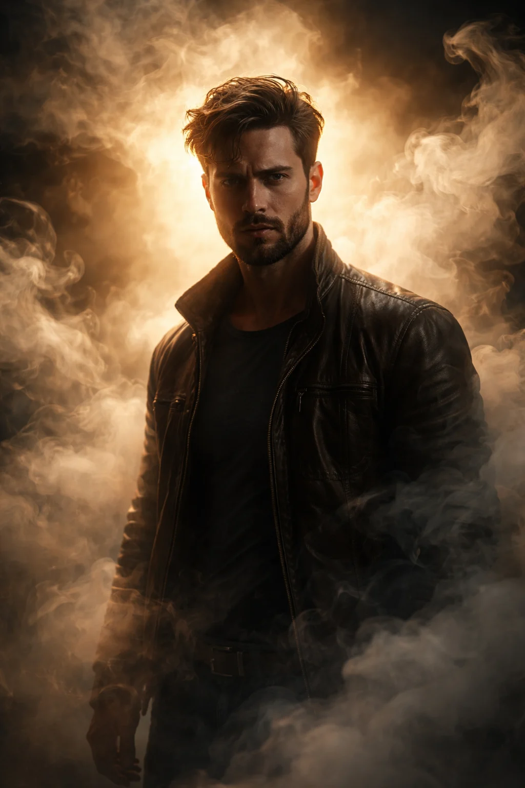 Use the uploaded image as subject, apply smoke effect interacting with strong backlight, glowing edges where light passes through thinner smoke, deeper shadows in dense areas, soft bloom effect around light source, layered atmospheric depth, cinematic lighting balance, aspect ratio [AR] Swirling Energy Motion Prompt: